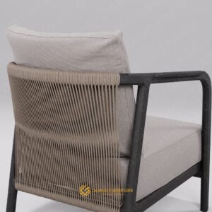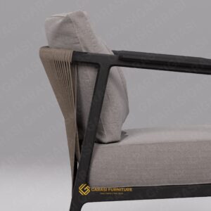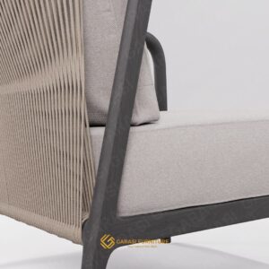 Estetika Modern dengan Aksen Rattan Rope: Becca Lounge Chair menampilkan desain yang artistik dengan ciri khas aplikasi anyaman tali rotan (rattan rope) pada bagian sandaran. Aksen ini menggantikan jeruji kayu konvensional, memberikan tampilan visual yang lebih dinamis, tekstural, dan “bernapas”.