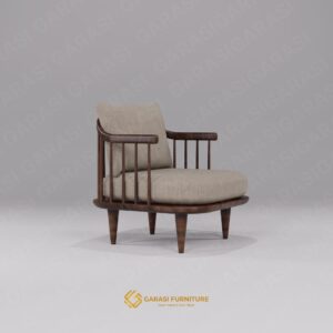 Estetika Japandi dengan Aksen Jeruji: Nara Lounge Chair menampilkan desain yang timeless dengan ciri khas detail jeruji (slats) kayu vertikal pada bagian lengan dan samping. Aksen ini tidak hanya mempercantik tampilan visual yang ringan dan “bernapas”, tetapi juga memberikan kesan tropis modern yang kuat.