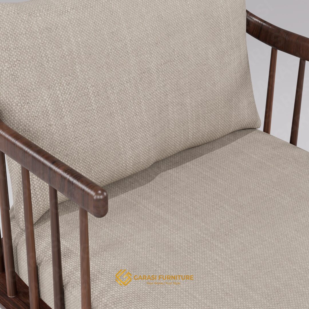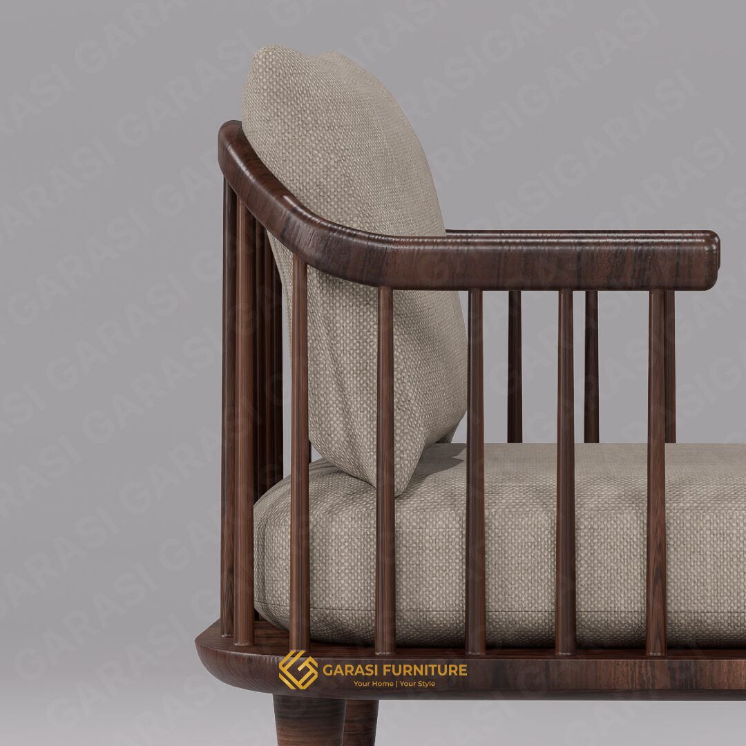 Estetika Japandi dengan Aksen Jeruji: Nara Lounge Chair menampilkan desain yang timeless dengan ciri khas detail jeruji (slats) kayu vertikal pada bagian lengan dan samping. Aksen ini tidak hanya mempercantik tampilan visual yang ringan dan “bernapas”, tetapi juga memberikan kesan tropis modern yang kuat.