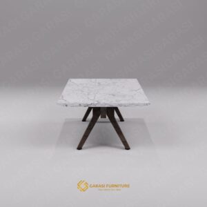 White Carrara Marble (Italy): Mahkota dari meja ini adalah permukaan top table yang menggunakan Marmer Carrara asli Italia. Dikenal di seluruh dunia karena warna dasar putihnya yang bersih dengan guratan urat (veins) abu-abu yang halus dan acak.