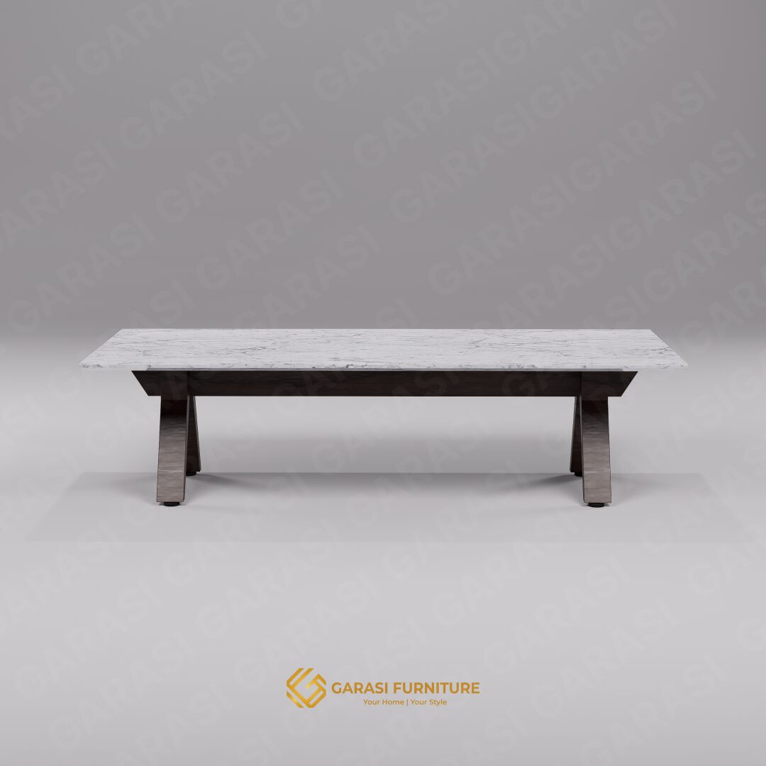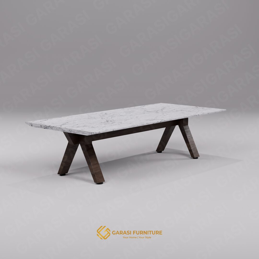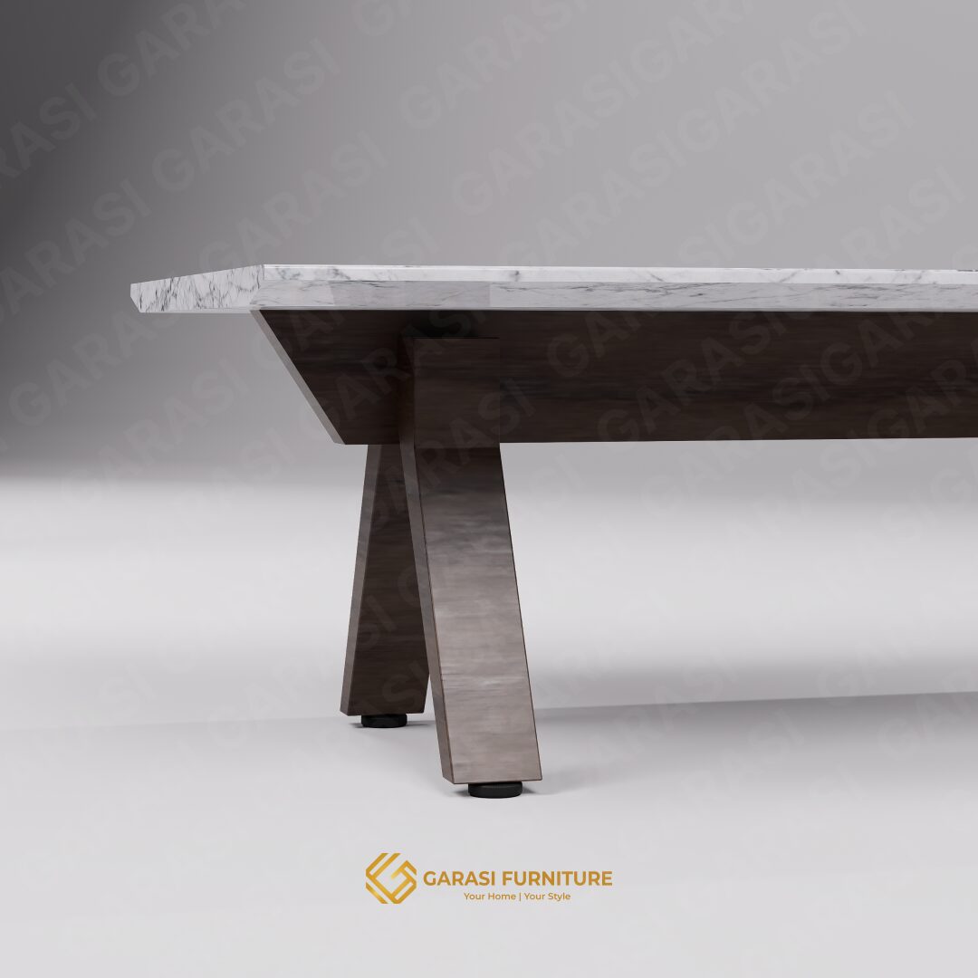 Siluet Modern Geometris: Kroma Coffee Table menampilkan desain kaki yang unik dengan struktur menyilang (angular legs) yang kokoh, memberikan kesan dinamis dan arsitektural. Bentuk persegi panjangnya yang luas menciptakan keseimbangan visual yang sempurna.