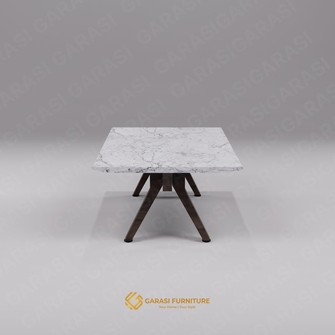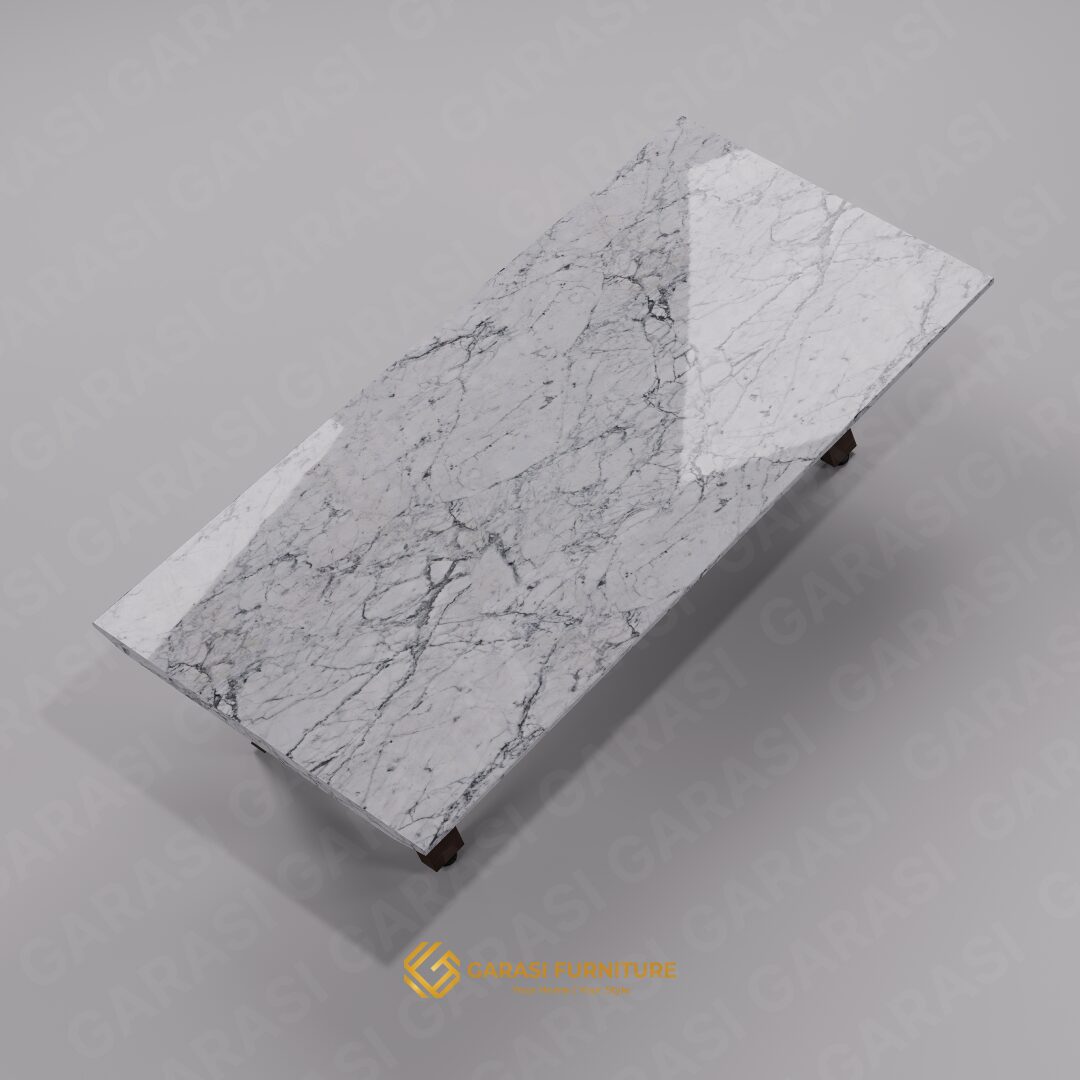 White Carrara Marble (Italy): Mahkota dari meja ini adalah permukaan top table yang menggunakan Marmer Carrara asli Italia. Dikenal di seluruh dunia karena warna dasar putihnya yang bersih dengan guratan urat (veins) abu-abu yang halus dan acak.