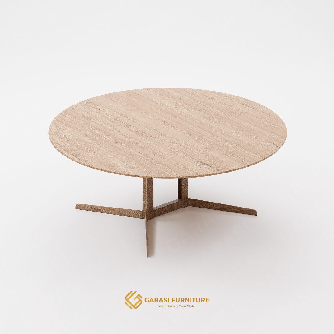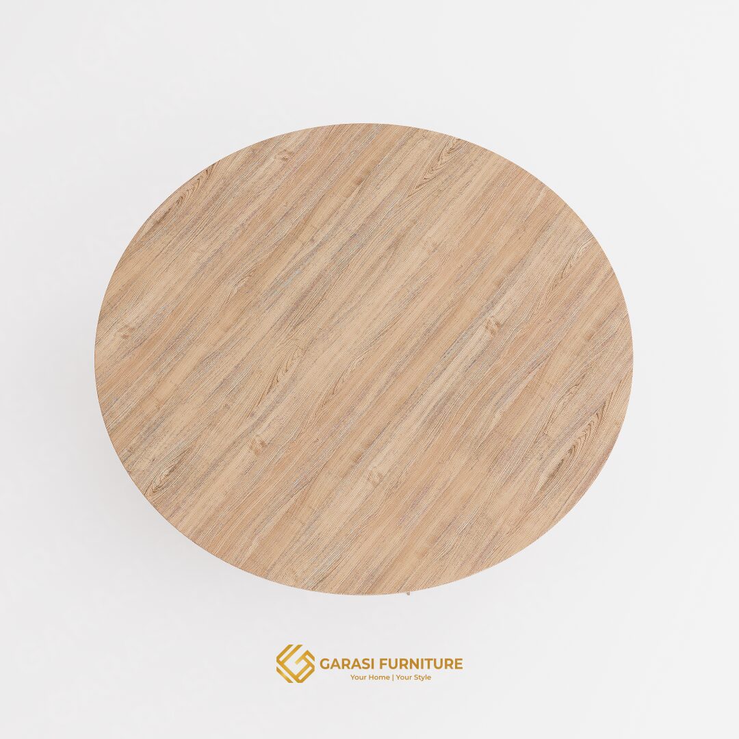 Bentuk Bulat Organik: Diameter 80 cm adalah ukuran yang ideal untuk meja kopi. Bentuk bulatnya yang tanpa sudut tajam memberikan aliran energi yang luwes di ruangan, aman bagi anak-anak, dan memudahkan sirkulasi gerak di ruang keluarga yang terbatas.