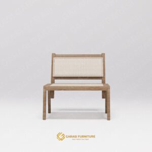 Handcrafted Detail: Dikerjakan dengan ketelitian tinggi oleh pengrajin ahli Garasi Furniture. Pemasangan anyaman dilakukan secara manual dengan tarikan yang kencang agar tidak kendur, sementara sambungan kayu dikerjakan dengan presisi halus.
