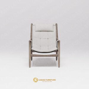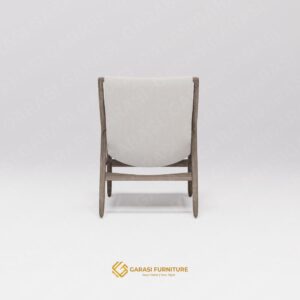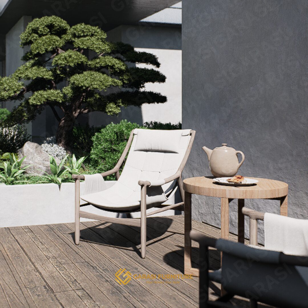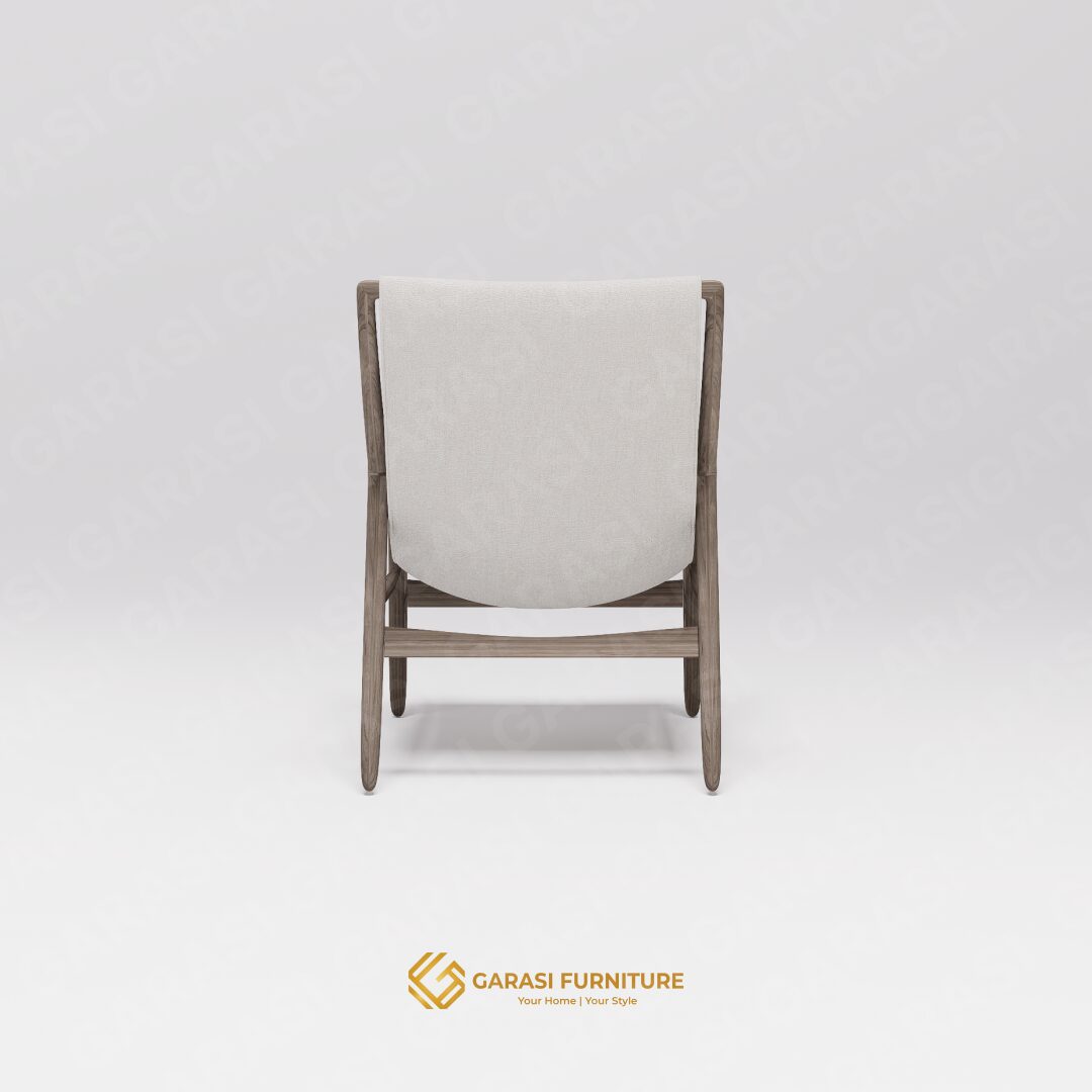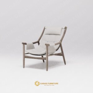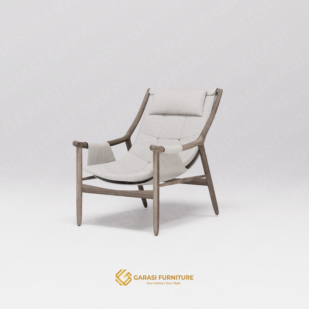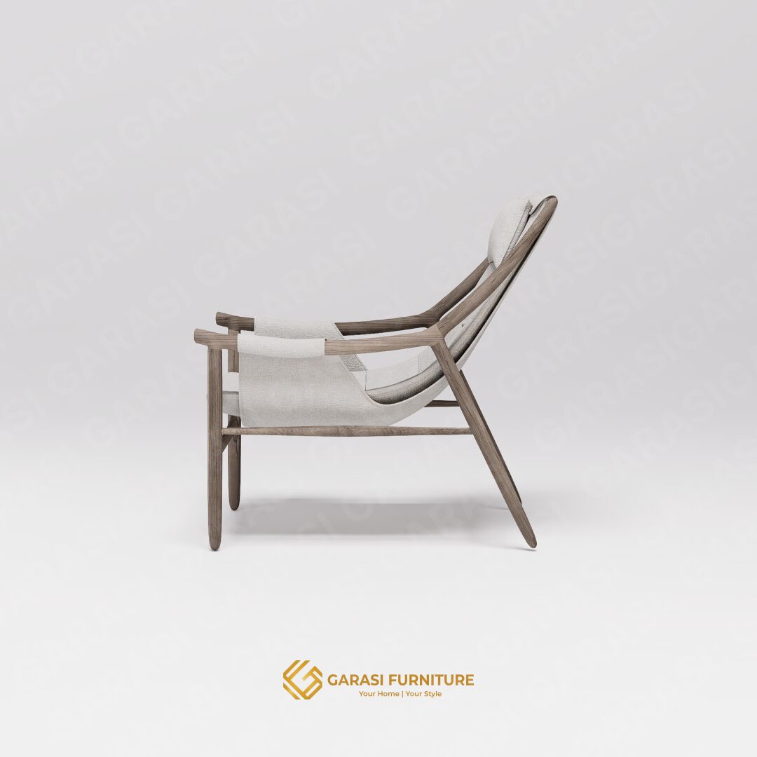 Estetika Suspended Seat: Kaira Sling Chair tidak menggunakan bantalan busa tebal konvensional. Sebaliknya, ia menggunakan konstruksi kain yang dibentangkan kuat pada rangka kayu. Desain ini memberikan tampilan yang sleek, modern, dan tidak memakan volume visual ruangan.